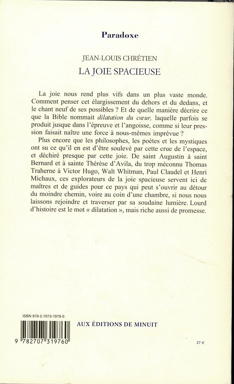 Essai sur la dilatation, La joie spacieuse, JeanLouis Chrtien, Minuit. Des milliers de livres avec la livraison chez vous en 1 jour ou en magasin avec 5 de rduction ou tlchargez la version eBook. Dcouvrez La joie spacieuse Essai sur la dilatation le livre de JeanLouis Chrtien sur decitre. fr 3me libraire sur Internet avec 1 million de livres disponibles en livraison rapide domicile ou en relais. La joie nous rend plus vifs dans un plus vaste monde. Comment penser cet largissement du dehors et du dedans, et le chant neuf de ses possibles? Et de quelle manire dcrire ce que la Bible nomma JeanLouis Chrtien prsente avec un grand art ces explorateurs de la joie spacieuse, il dialogue avec ces disciples de la dilatation spirituels, mystiques ou potes tels Bossuet, Augustin, Grgoire le Grand, Traherne, Whitman ou encore Claudel. Essai sur la dilatation peut tre considr comme lautre versant de ltude quil a dj mene sur lpuisement, la drliction, lacdie ( De la fatigue, 1996). Fabula, actualits et ressources pour la recherche et les tudes littraires: revue, annonces de colloques et d'appels contribution, parutions, comptes rendus critiques et dbats La Joie spacieuse, essai sur la dilatation, de JeanLouis Chrtien ditions de Minuit, 272 p. Seule la parole dmesure, des potes et des mystiques, dit le dmesure de la joie. Achetez La Joie Spacieuse Essai Sur La Dilatation de JeanLouis Chrtien Format Broch au meilleur prix sur Priceminister Rakuten. Profitez de l'AchatVente Garanti. La joie spacieuse essai sur la dilatation essai sur la dilatation De JeanLouis Chrtien Les ditions de Minuit Paradoxe Trouvez les offres des librairies les plus proches: trouvez moi. ou entrez le nom de votre ville Offres. LA JOIE SPACIEUSE ESSAI SUR LA DILATATION un ouvrage extraordinaire qui vous dilate coeur et esprit par JEANLOUIS CHRTIEN Editions de Minuit. La Joie spacieuse JeanLouis Chrtien La joie nous rend plus vifs dans un plus vaste monde. Comment penser cet largissement du dehors et du dedans, et le chant neuf de ses possibles? Et de quelle manire dcrire ce que la Bible nommait dilatation du cur, laquelle parfois se produit jusque dans lpreuve et langoisse, comme si leur pression faisait natre une force nous. Encuentra La joie spacieuse: Essai sur la dilatation (Paradoxe) de JeanLouis Chrtien (ISBN: ) en Amazon. Il publie aujourdhui La Joie spacieuse Essai sur la dilatation. Quand on a le cur gros, que quelque chose semble le serrer, on est au bord des larmes. Mais lorsque le cur se dilate, toute lexistence parat prendre une autre dimension. OUVRAGE EN ATTENTE DE REDACTEUR POUR COMPTERENDU DANS ACTA FABULA JeanLouis Chrtien La Joie spacieuse. Essai sur la dilatation Les Editions de Minuit Si, de La Joie spacieuse, on ne lisait que le soustitre (Essai sur la dilatation), on pourrait penser un trait sur les mtaux Ce nest pas au sens physique que jai pris dilatation. Achetez La Joie Spacieuse Essai Sur La Dilatation de JeanLouis Chrtien Format Broch au meilleur prix sur Rakuten. Profitez de l'AchatVente Garanti! En utilisant Rakuten, vous acceptez l'utilisation des cookies permettant de vous proposer des contenus personnaliss et de raliser des statistiques. En poursuivant votre navigation sur notre site vous acceptez l'utilisation de cookies, pour vous proposer des contenus personnaliss en fonction de vos centres d'intrts et mesurer la frquentation de nos services, pour en savoir plus et paramtrer les cookies, cliquez ici. La joie spacieuse Essai sur la dilatation JeanLouis Chrtien Date de parution: Les Editions de Minuit Collection: Paradoxe. Voir la prsentation du produit Voir le descriptif technique. Dcouvrez des commentaires utiles de client et des classements de commentaires pour La joie spacieuse: Essai sur la dilatation sur Amazon. Lisez des commentaires honntes et non biaiss sur les produits de la part nos utilisateurs. Dcouvrez et achetez La Joie spacieuse, Essai sur la dilatation JeanLouis Chrtien Les ditions de Minuit sur. La joie spacieuse: Essai sur la dilatation JeanLouis Chrtien. Emiri Hayashi 2 critiques Le Troisime Monde: Le Monde bleu Fabrice Constant Pomoin. JeanLouis Chrtien, Paru en 2007 chez Les Editions de Minuit Broch, 259 pages d'Occasion ou neuf Comparez les prix en ligne et achetez ce livre moins cher. La joie spacieuse est un livre de JeanLouis Chrtien. Synopsis: La joie nous rend plus vifs dans un plus vaste monde. Comment penser cet largissement. C'est Georges Snyders qui a insist avec force sur la joie l'cole. Essai sur la dilatation, Paris, d. Charles Ppin, propos de son essai La joie spacieuse (revue de presse de l'diteur, 2007). Dcouvrez le livre La Joie spacieuse de JeanLouis Chrtien avec un rsum du livre, des critiques Evene ou des lecteurs, des extraits du livre La Joie spacieuse, des anecdotes et des photos du livre La Joie. JeanLouis Chrtien, La joie spacieuse. Essai sur la dilatation (Paris, Editions de Minuit, 2007) Il publie aujourd'hui la Joie spacieuse Essai sur la dilatation. Quand on a le coeur gros, que quelque chose semble le serrer, on est au bord des larmes. JeanLouis Chrtien, La joie spacieuse: Essai sur la dilatation. Ds que la joie se lve, tout slargit, affirme JeanLouis Chrtien (p. in Buy La joie spacieuse essai sur la dilatation book online at best prices in india on Amazon. Read La joie spacieuse essai sur la dilatation book reviews author details and more at Amazon. Free delivery on qualified orders. La joie spacieuse: Essai sur la dilatation [JeanLouis Chrtien on Amazon. FREE shipping on qualifying offers. Rare Book Note: Citations are based on reference standards. However, formatting rules can vary widely between applications and fields of interest or study. The specific requirements or preferences of your reviewing publisher, classroom teacher, institution or organization should be applied. Leia La Joie spacieuse Essai sur la dilatation de JeanLouis Chrtien com a Rakuten Kobo. La joie nous rend plus vifs dans un plus vaste monde. Comment penser cet largissemen